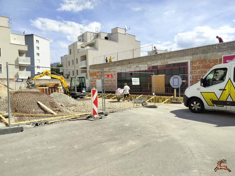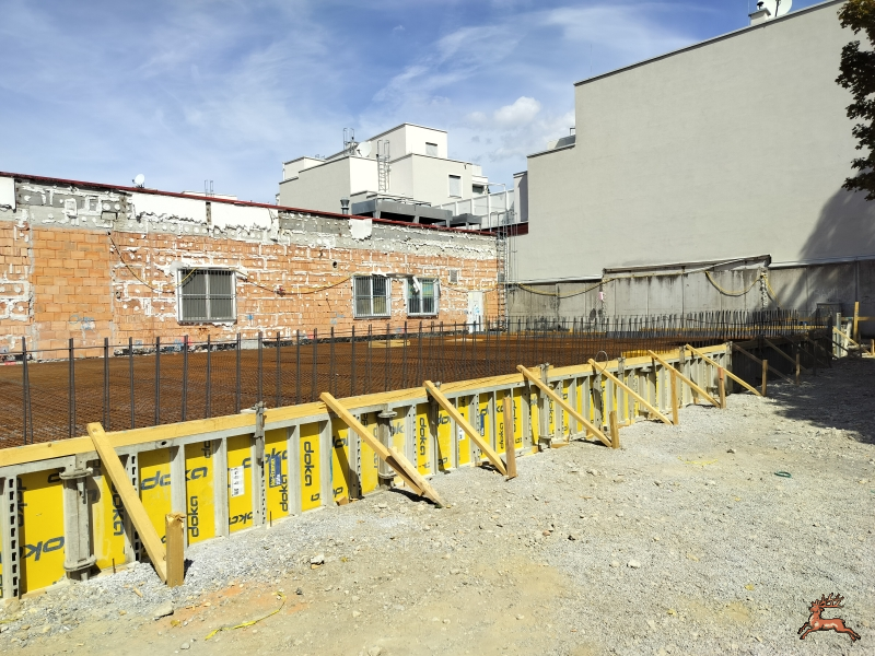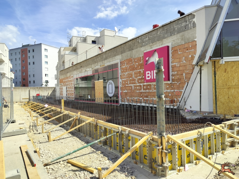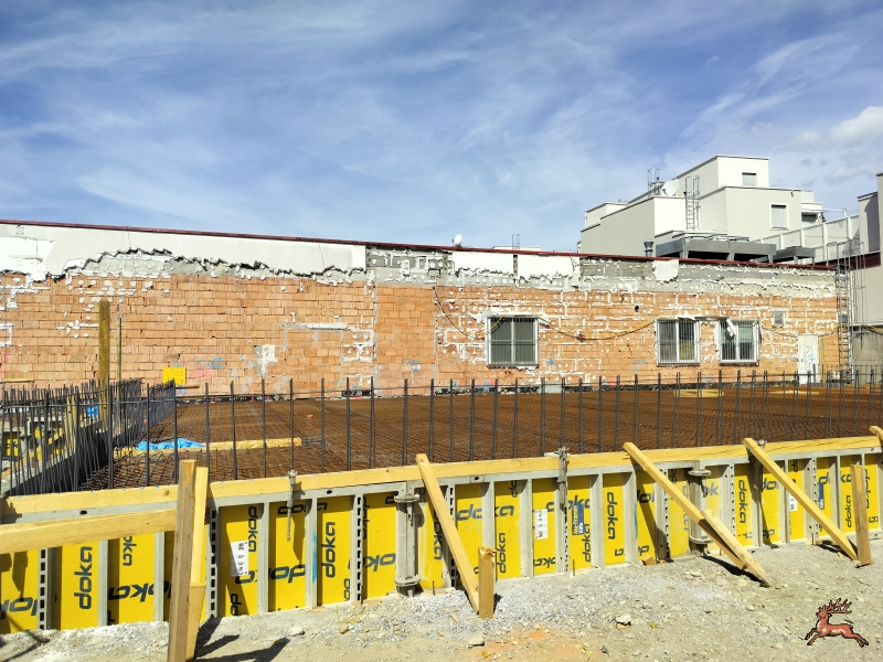 Die Verschalungen zur Herstellung der Fundamentplatten der Erweiterung der BIPA und Billa-Filiale in der Ziegelhofstraße/Pirquetgasse sind vorbereitet und mit Baueisen versehen. Auch am Dach wird gearbeitet.
