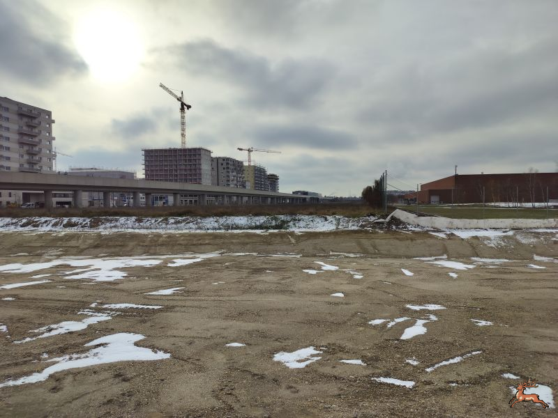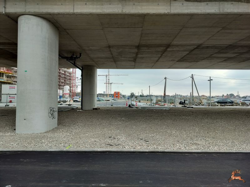 Der ostliche Begleitweg zur U-Bahn-Trasse ist bereits mit Fahrbahn, Radweg und Gehsteig asphaltiert und mit Beleuchtungskörpern ausgestattet.