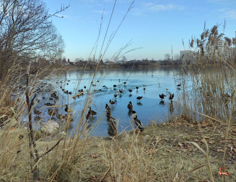 Eine Frostperiode in Wien und weiten Teilen Europas, haben viele Naturgewässer in Wien mit einer Eisdecke versehen. Auch der Hirschstettner See hat eine fast zugefrorene Oberfläche. Nur an der Nordseite, nahe der Babybucht, ist (noch) ein kleiner Entenpool für die Wasservögel vorhanden.