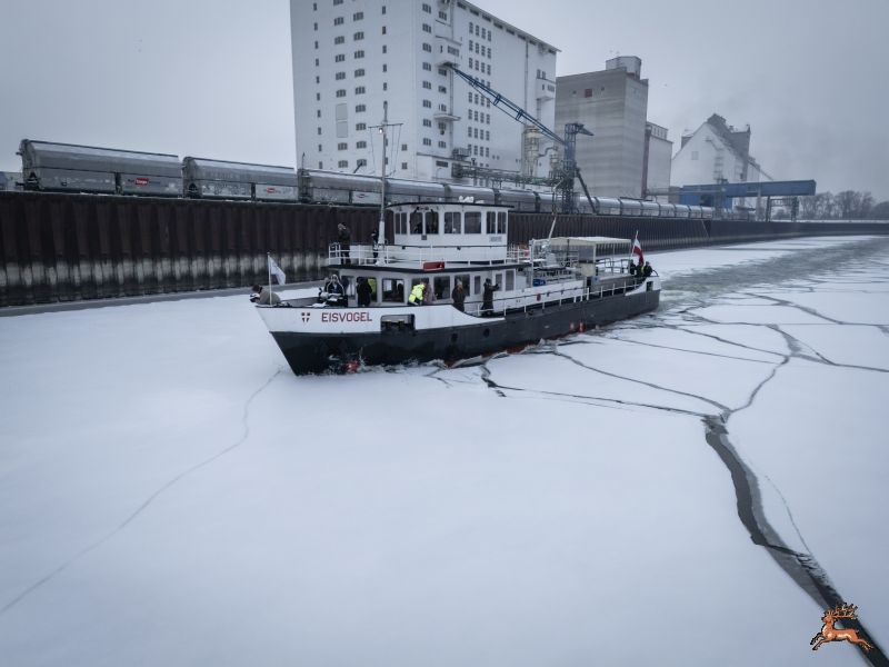 Auf Grund der anhaltenden Temperaturen um den Gefrierpunkt, bildete sich im Wiener Hafen eine etwa sechs Zentimeter dicke Eisschicht. Damit der Eisdruck auf die im Hafen überwinternden Schiffe nicht zu groß wird, bricht das Mehrzweckschiff (Zug-, Berge- Feuerlöschschiff und Eisbrecher) MS Eisvogel das Eis.