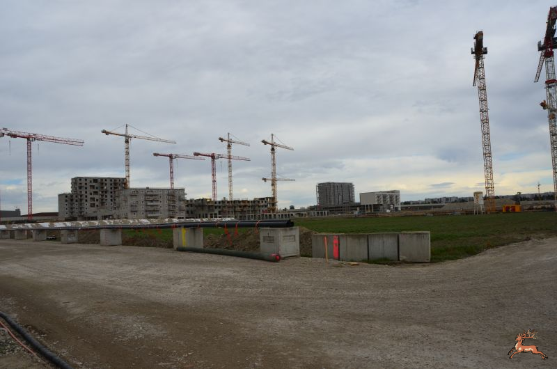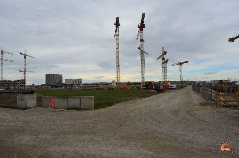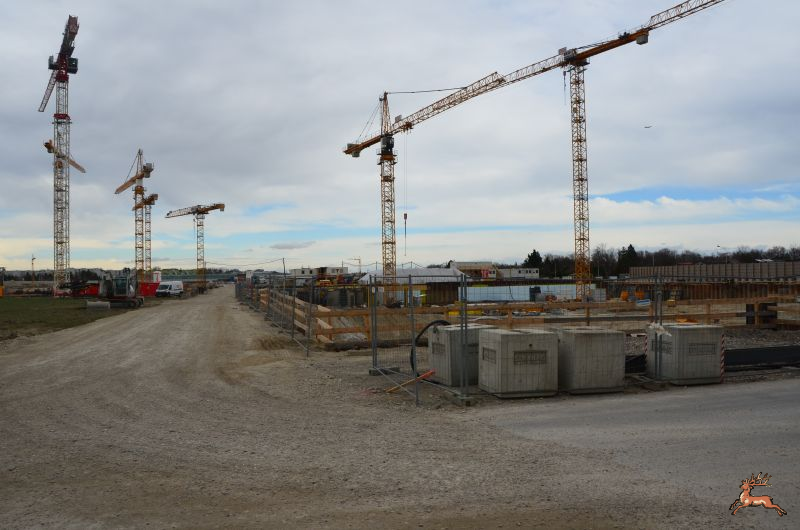 Der ehemalige Feldweg ist für schwere Baufahrzeuge befestigt, Kräne wachsen aus den noch günen Feldern, auf den Bauplätzen nahe der U-Bahn-Trasse sind schon die ersten Hochhäuser zu erkennen.