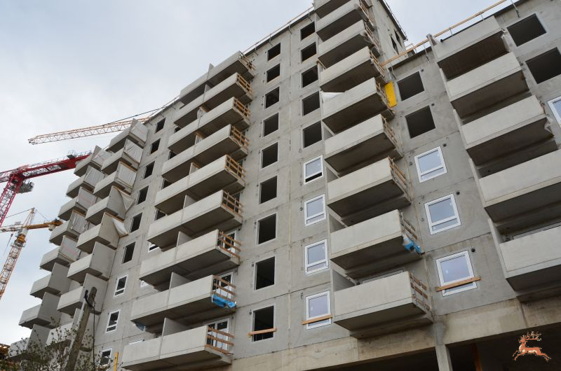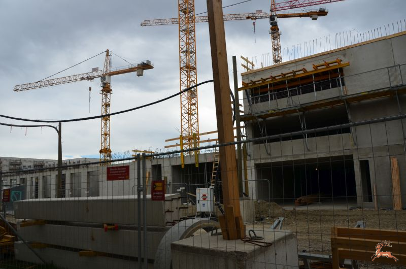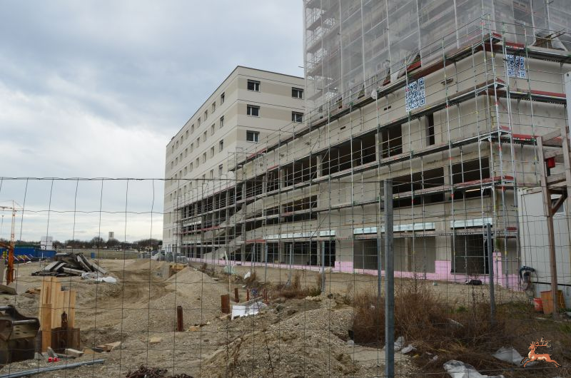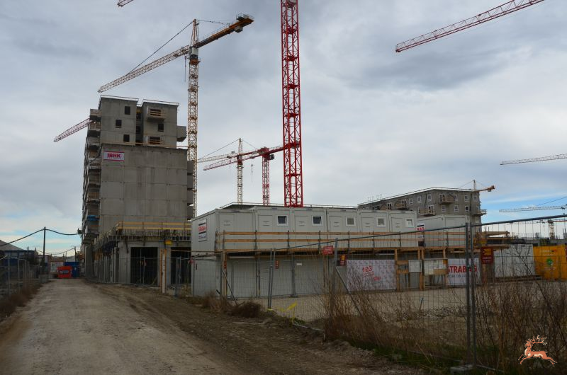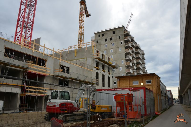 Der erste Wohnblock, auf Bauplatz M, direkt am Tunnenportal zur Stadtstraße, scheint mit Fenstern und Fassade nahezu fertiggestellt. Auch die Bauten entlang der U-Bahn-Trasse streben rasch in die Höhe und sind bereits teilweise mit Fenstern versehen.