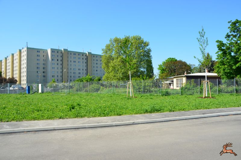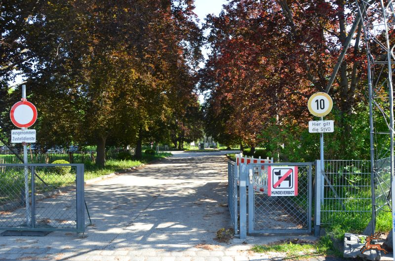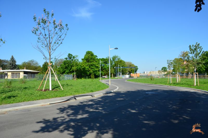 Mit frischen Trieben präsentiert sich der Eingangsbereich Süd (Quadenstraße 15). Die ehemalige Schmetterlingswiese wird von einer neuen Zufahrtsstraße zu den Werkstätten durchzogen. Eine Rohrbrücke samt Schlauchleitung und Filtercontainer (?) zur Entwässerung (?) des Tunnels der Stadtstraße stört das Frühlingsbild.