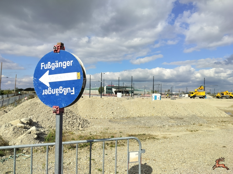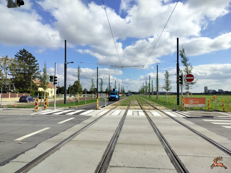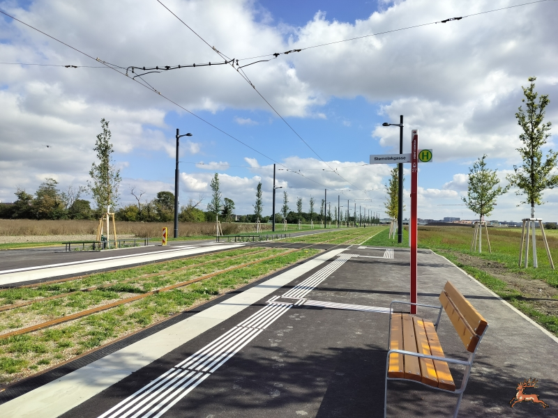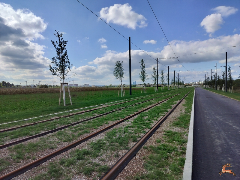 Die Hirschstettner Allee präsentiert sich aufgeräumt und wird von (deutlich weniger als 300) Bäumen gesäumt. Bei den Haltestellen mitten am Feld sind die Fahrgäste (noch) Sturm und Regen ausgesetzt, denn Wartehäuschen fehlen (noch). Über die zweite (*) Mayrederbrücke mit Haltestelle und Zugang zur U2-Aspern Nord gelangt die Bim in die Seestadt zum Nelson-Mandela-Platz. Dieser Vorplatz zur U2-Station und Umsteigeknoten zu zahlreichen Buslinien gleicht allerdings noch sehr einem Bauprojekt mit unzähligen Bauzäunen, Absperrungen und Umleitungen für zu Fußgehende. Beeteinrahmungen fehlt noch die Bepflanzung und der Fußweg zu den Wohngebieten der Seestadt ist auch nur wenig einladend gestaltet.